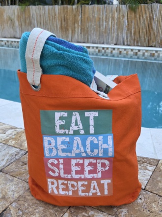 Eat + Beach + Sleep + Repeat: says it all for this fun and durable beach tote.