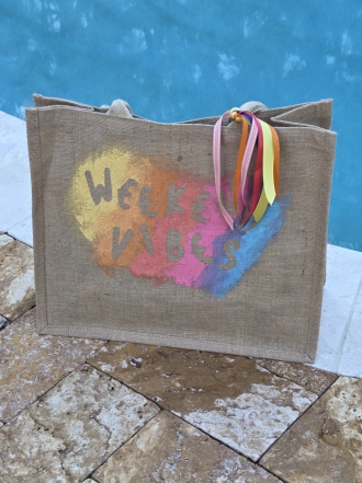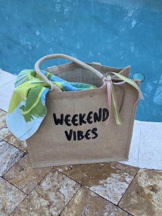 Perfectly sized, these plastic-lined jute totes can hold everything you need for a weekend day trip.