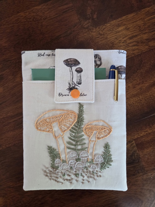 Protect your favorite stories in style with this beautifully crafted padded sleeve, designed to fit most Kindle e-readers or small paperback books, journals and calendars. The sleeve features a unique, hand-embroidered mushroom design, making it one-of-a-kind.